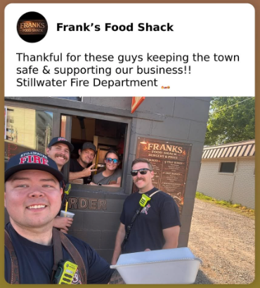 Frank's Food Shack at night: wooden sign, team in front of the brick building on the strip