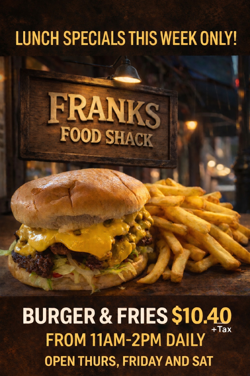 Frank's Food Shack at night: wooden sign, team in front of the brick building on the strip